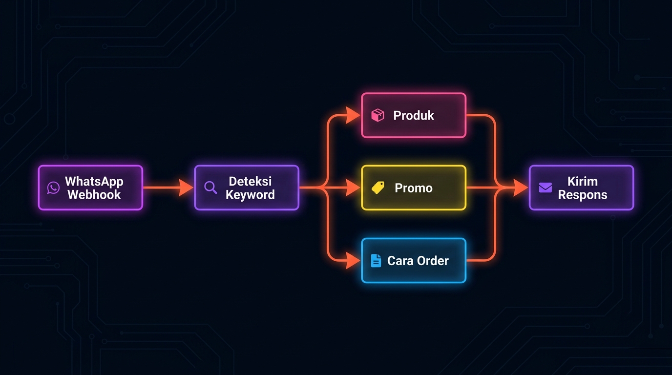 Template workflow n8n sederhana untuk customer service toko fashion via WhatsApp menggunakan keyword routing. Tanpa AI mahal — hanya logika sederhana yang ampuh untuk mengarahkan customer ke info produk, promo, atau cara order berdasarkan kata kunci yang mereka kirim.