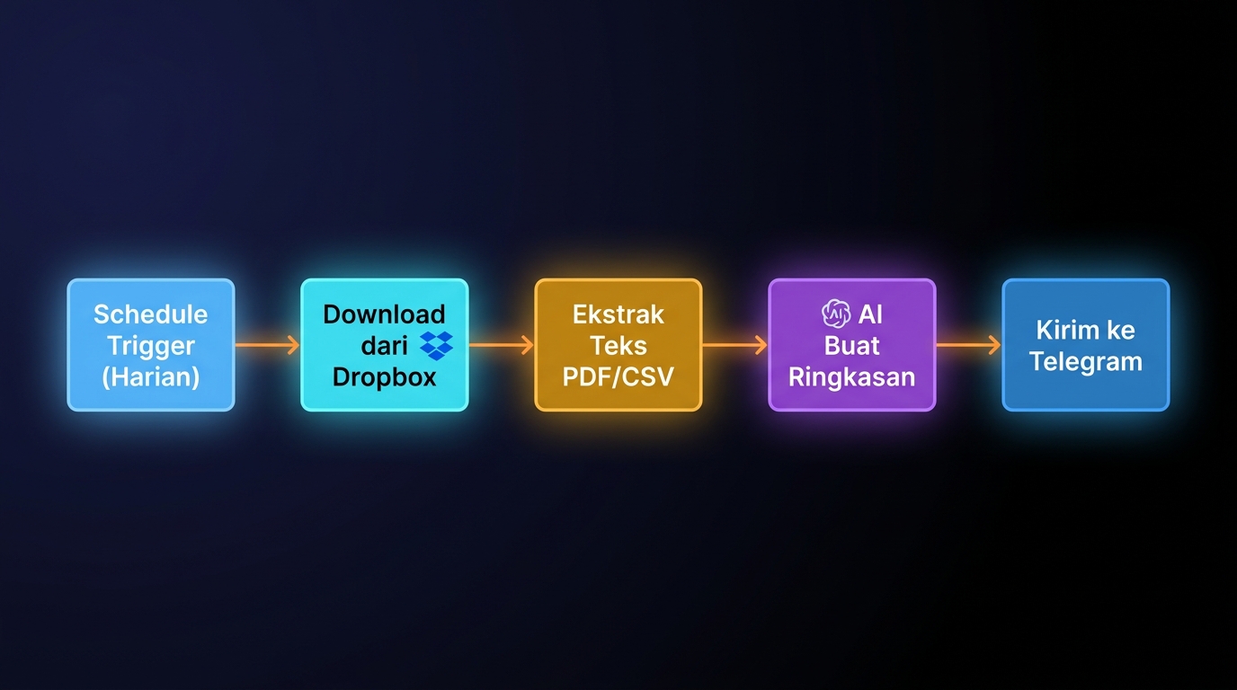 Template workflow n8n untuk membaca file laporan (PDF/CSV) dari Dropbox secara otomatis setiap hari, mengekstrak data penting dengan AI, dan mengirimkan ringkasan ke Telegram. Cocok untuk tim yang menerima laporan harian dari berbagai partner atau supplier.